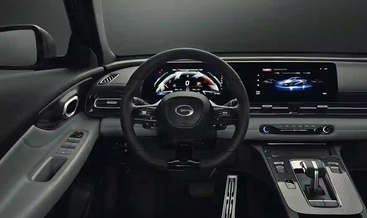 Место водителя GAC EMPOW выполнено в спортивном стиле: руль со скошенной нижней секцией и меткой нулевого положения, а также дизайн селектора коробки передач, выполненный в авиационном стиле, усиливают спортивную атмосферу салона.